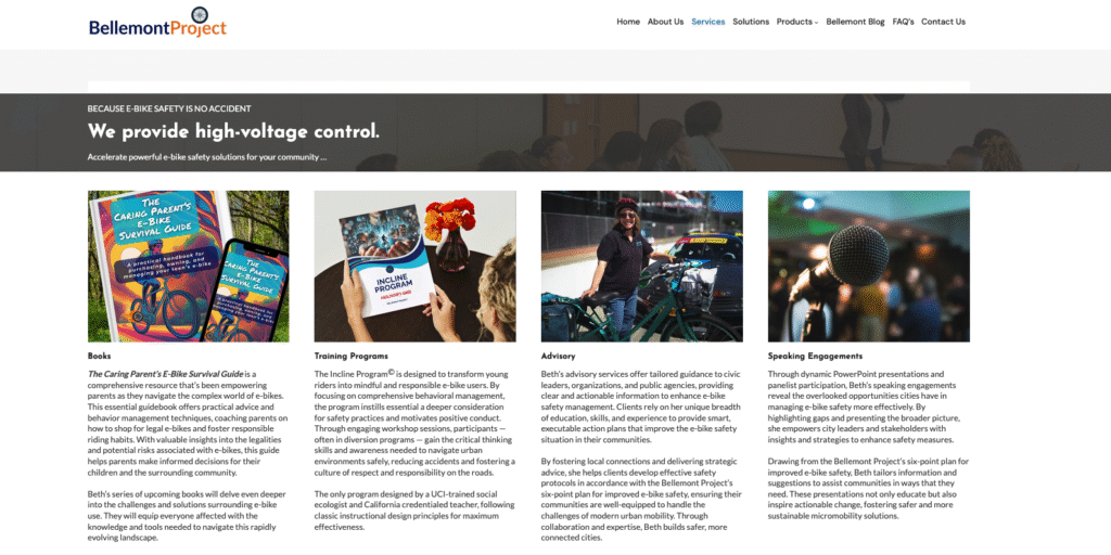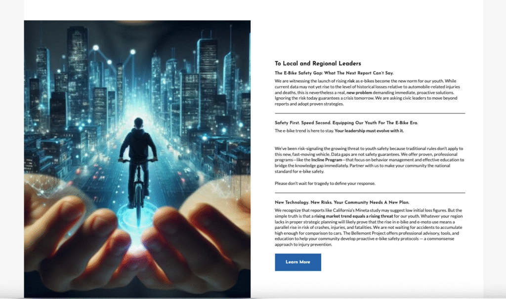 The Bellemont Project is a leading social enterprise committed to mastering e-bike safety in communities across the U.S., specifically addressing the growing challenges associated with teen and tween riders. Founded by Beth Black—a UCI-trained social ecologist, writer, and California credentialed teacher—the organization provides comprehensive, proactive solutions based on its proprietary Six-Point Plan for Strategic E-Bike Solutions. The organization’s resources include The Caring Parent’s E-Bike Survival Guide, which prepares parents to be smart consumers and better communicators with their children. Additionally, the Bellemont Project offers professional advisory services to civic leaders, dynamic speaking engagements, and the signature Incline Program©, a behavioral management training program that works with young riders and their parents to foster responsible riding habits and reduce accidents.